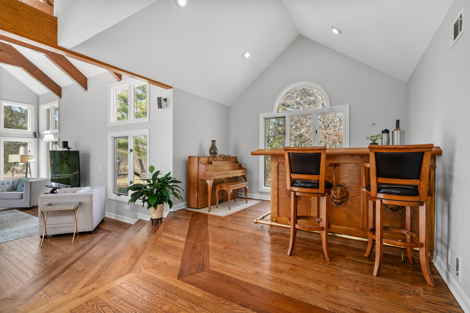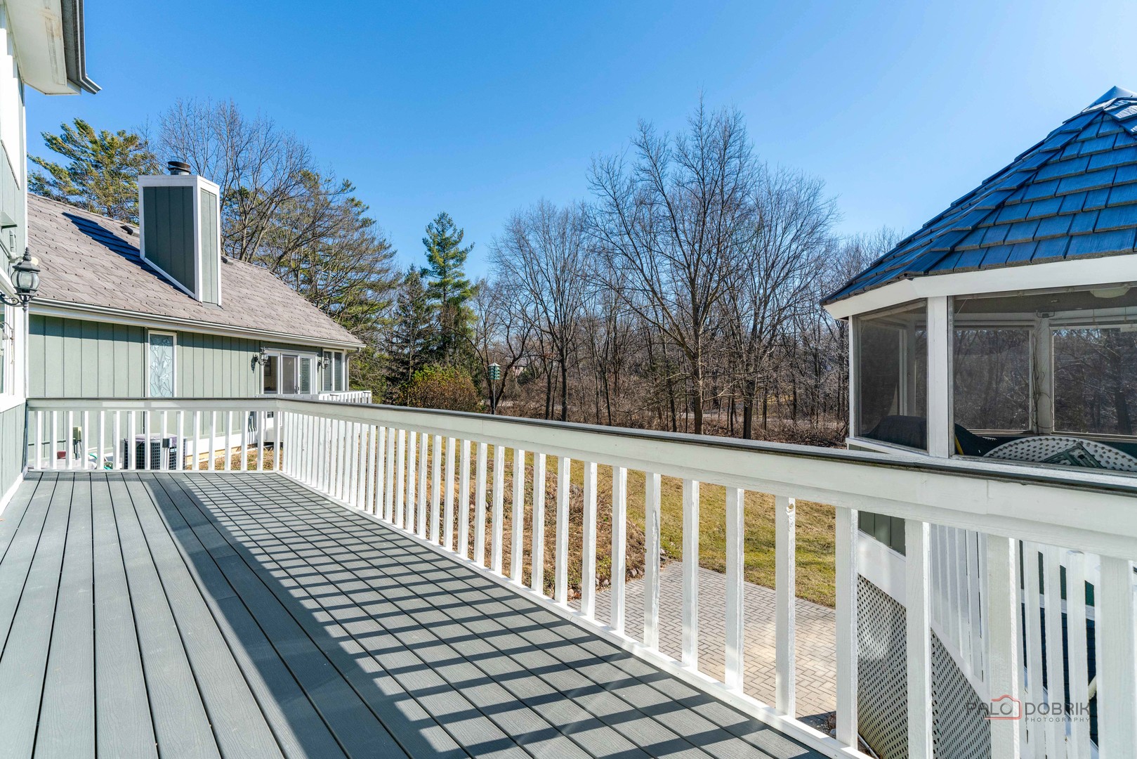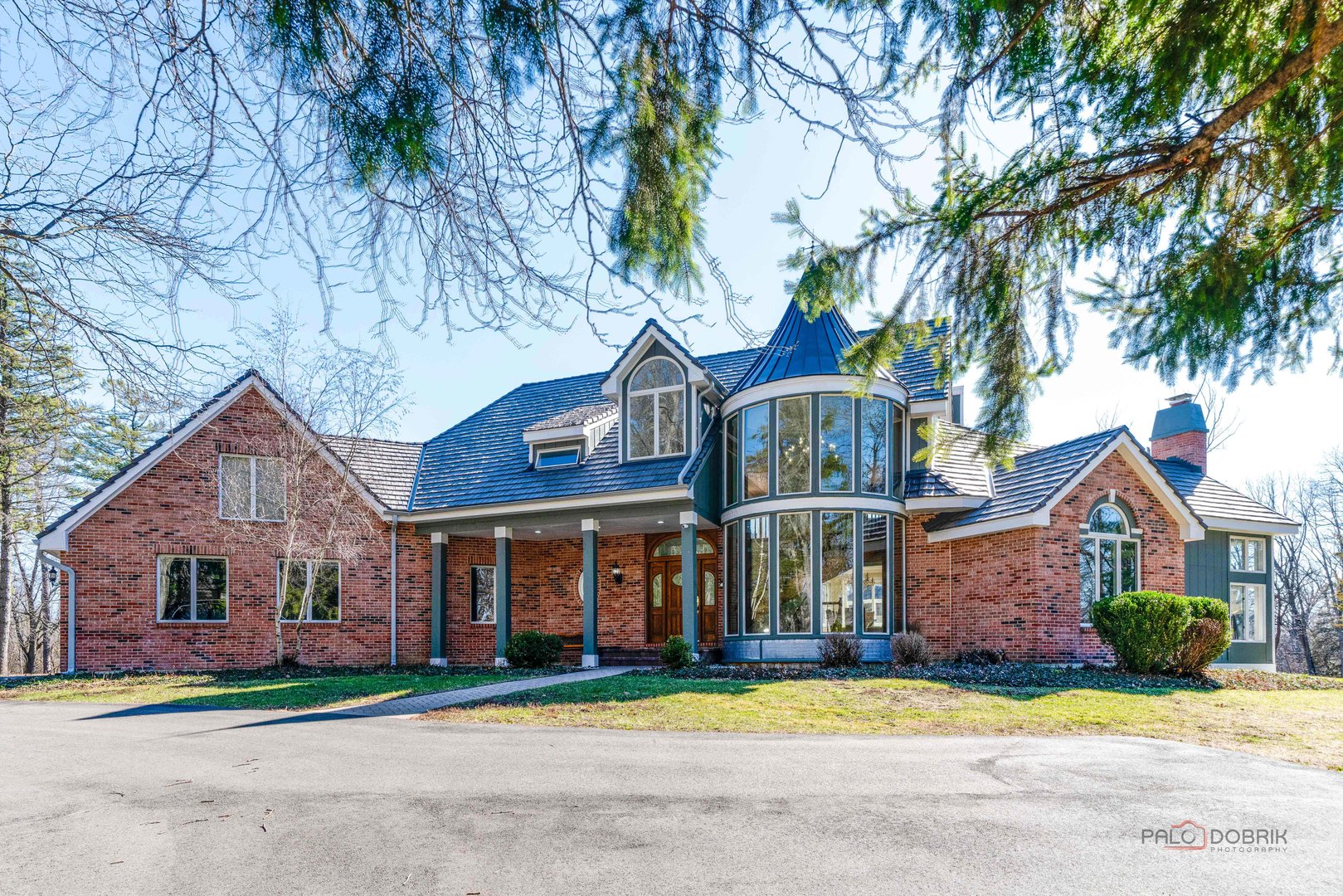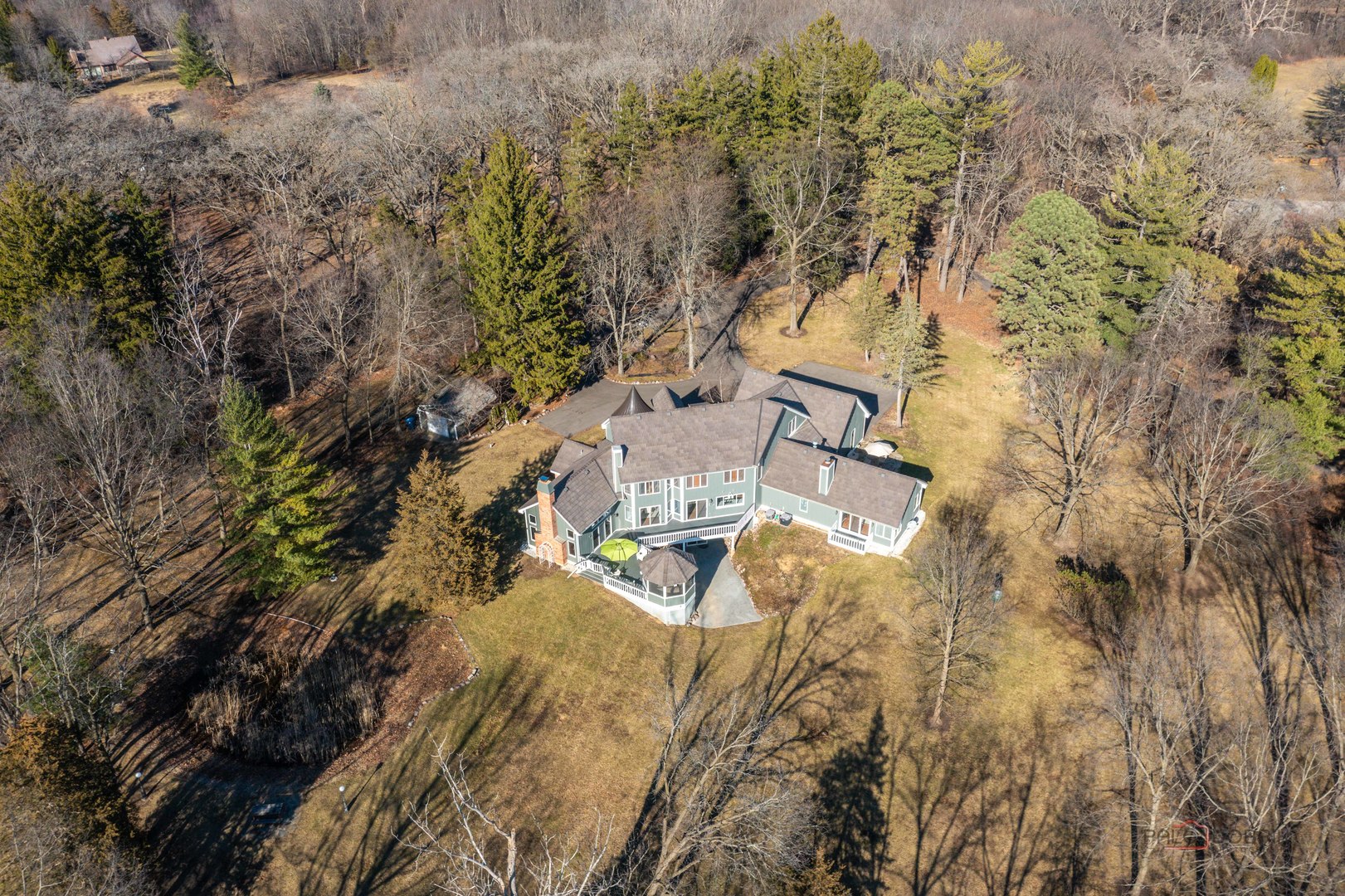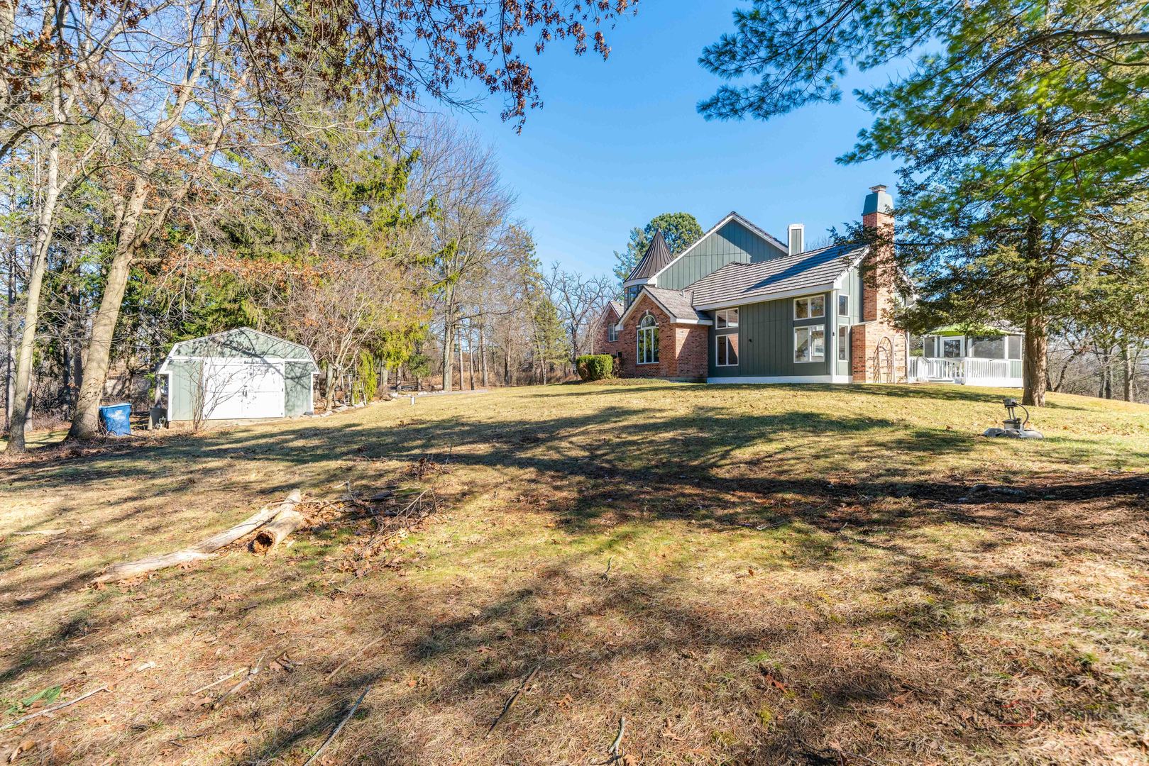 Extraordinary 4-bedroom, 4.1-bath estate nestled on a serene 5-acre wooded lot offering exceptional privacy. A brick paver front porch welcomes you into a breathtaking foyer showcasing soaring two-story ceilings and a dramatic spiral staircase framed by a grand floor-to-ceiling wall of windows. Fresh paint all throughout home 2025. The formal dining room is ideal for elegant gatherings and special occasions. The gourmet kitchen is a chef's dream, featuring a massive island, striking new 2025 marble countertops, abundant new white cabinetry, and brand-new 2025 appliances including a double oven. A bright and airy eating area provides access to the expansive composite deck and charming gazebo-perfect for indoor-outdoor entertaining. The living room is truly the showstopper, boasting vaulted two-story ceilings with wood beams, a floor-to-ceiling stone fireplace, exterior deck access, and a stylish wet bar. Retreat to the luxurious main-level primary suite offering a vaulted ceiling, two cedar walk-in closets, private balcony, and a spa-like ensuite with dual vanities, oversized whirlpool tub, separate shower, and private patio access. The main level is completed by a half bath and convenient laundry room. Upstairs, you'll find BRAND NEW 2026 carpet with three spacious bedrooms, including one with a private ensuite and walk-in closet that opens to an impressive loft, along with an additional full bath. The finished walkout basement provides endless possibilities with a large recreation room featuring a wet bar and fireplace, a full bath, and direct access to an expansive brick paver patio. Additional highlights include a circular driveway, 3-car garage, storage shed, brand new furnace (2026), DaVinci roof (2023), composite deck (2023), and new driveway (2024). This remarkable property seamlessly blends luxury, comfort, and privacy-experience your dream home!